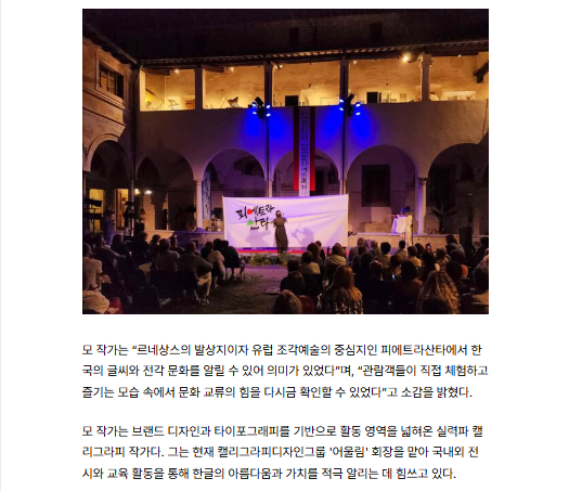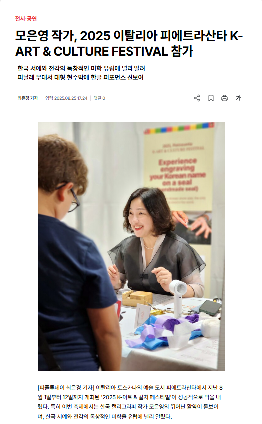 #모은영 #캘리그라피디자인 #갈매모은영 #calligraphy #케이아트 #전각체험 #피에트라산타 #이탈리아 #케이컬처페스티벌 #내이름도장 #한글이름도장 #글씨21 #일백헌 #피플투데이보도기사 #보도기사 #피플투데이
