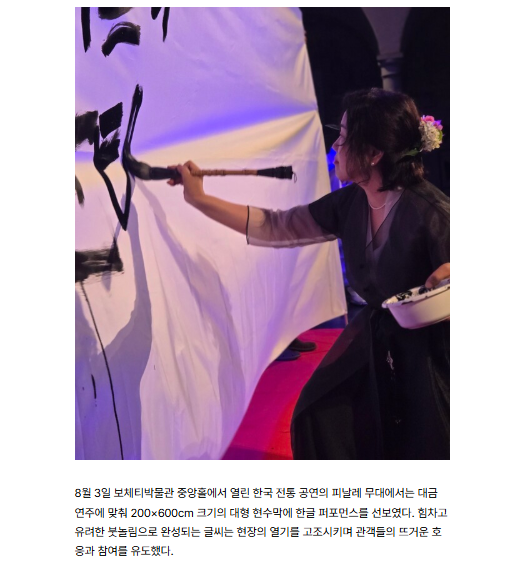 '한국 서예와 전각의 독창적인 미학 유럽에 널리 알려 피날레 무대서 대형 현수막에 한글 퍼포먼스 선보여'