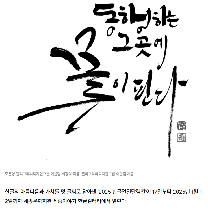 한글의 아름다움과 가치를 멋 글씨로 담아낸 ‘2025 한글일일달력전’이 17일부터 2025년 1월 12일까지 세종문화회관 세종이야기 한글갤러리에서 열린다.