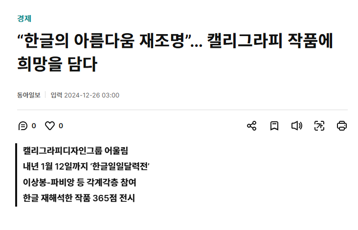 <기사 보러 가기> 동아일보 “한글의 아름다움 재조명”… 캘리그라피 작품에 희망을 담다